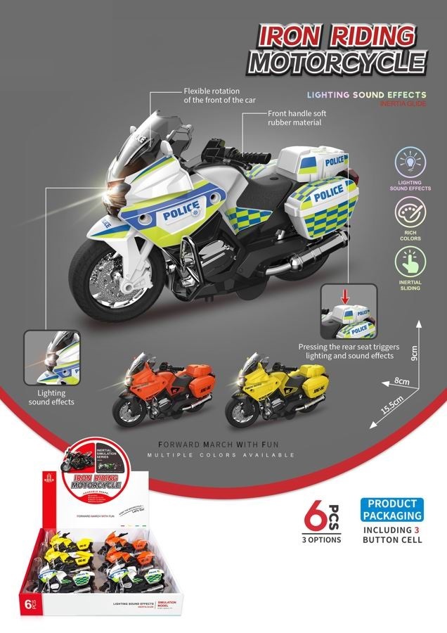 Motorka s efekty. Rozměry 15,5x8x9 cm. Na setrvačník. Světelné a zvukové efekty tlačítkem na boxu v zadní části motorky. 3xAG13 baterie součástí. 6 ks display box. przeczytaj całość