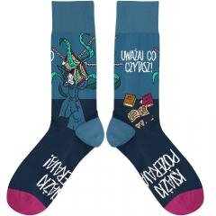Niektóre książki dosłownie pożerają może niekoniecznie swych czytelników, ale na pewno ich wolny czas. Uważaj na to, co czytasz i w jakich okolicznościach. Skarpetki z Wiedźmą i żarłoczną księgą będą dla Ciebie przestrogą. Świetnie sprawdzą się też w roli prezentu dla każdego mola...