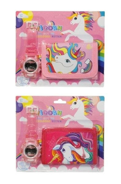 Zestaw portfel + zegarek. Portfel zdobi wizerunek jednorożca. Zegarek działa na baterie AG3. Bateria znajduje się w zabawce. Produkt zapakowany w kartonową podstawkę z przezroczystym kloszem Produkt występuje w kilku wersjach kolorystycznych, wybierany losowo. Cena dotyczy jednej sztuki.... przeczytaj całość