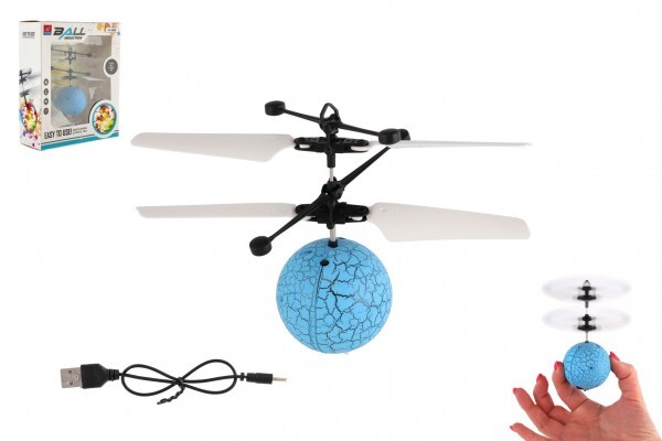 Vrtulníková koule létající plast 13x11cm reagující na pohyb ruky s USB kabelem modrá v krabičce