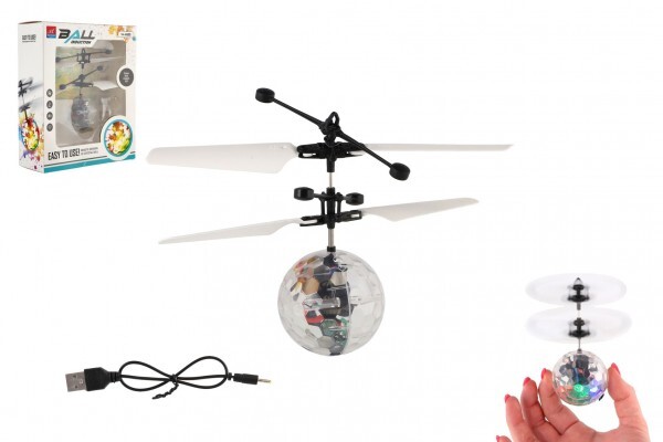 Vrtulníková koule létající plast 13x11cm reagující na pohyb ruky s USB kabelem průhledná v krabičce