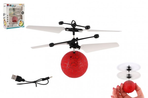 Vrtulníková koule létající plast 13x11cm reagující na pohyb ruky s USB kabelem červená v krabičce