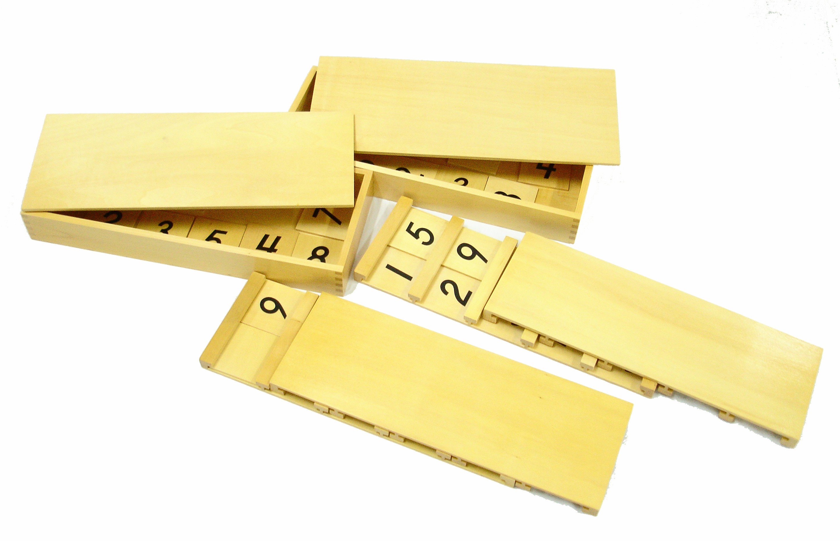 Sada obsahuje dva dřevěné rámečky, do kterých se vkládají dřevěné destičky s číslicemi 1 – 9. S tímto materiálem děti objevují čísla druhé desítky. Společeně s korálkovým materiálem, kdy mohou vytvářet množství od 11 do 19, si spojují množství s číselnými symboly. Pomocí Seguinovy tabulky se...