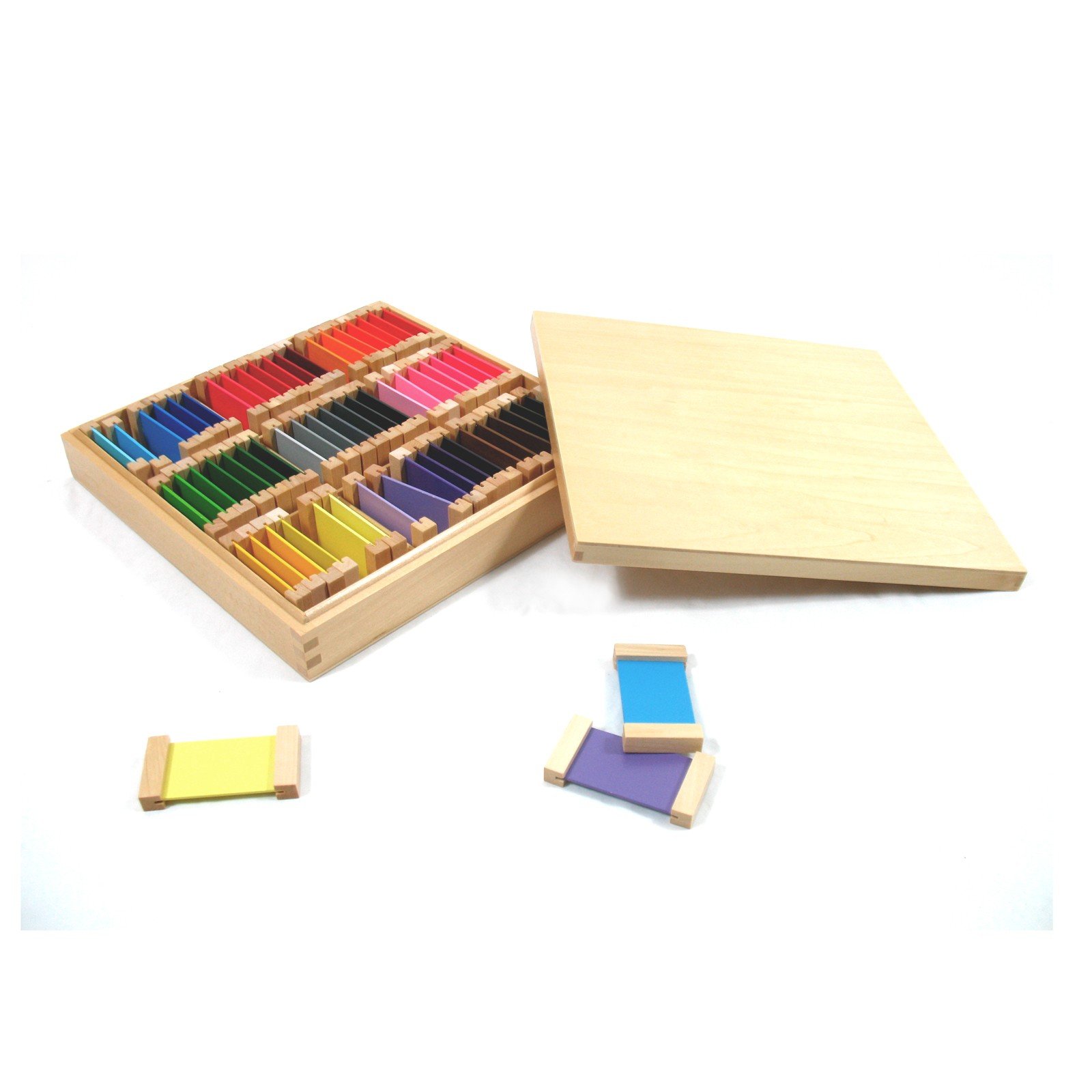 Velká sada 63 barevných destiček. Pokročilý materiál představuje dětem 9 barev a každou v sedmi různě intenzivních odstínech. Dřevěná krabice rozdělena do devíti přihrádek. Každá přihrádka obsahuje jednu barevnou řadu se sedmi destičkami. Jsou seřazené od světlé po tmavou. Destičky jsou zasazené...