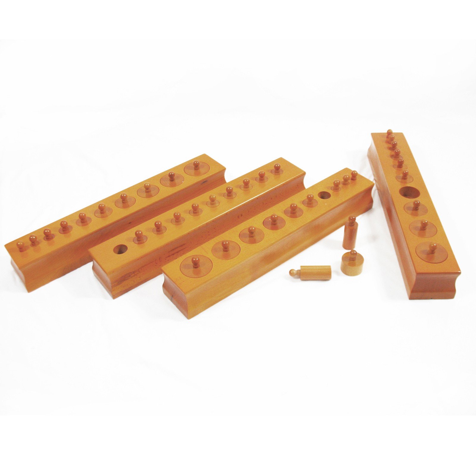Jedna ze základních smyslových pomůcek zahrnuje čtyři dřevěné bloky, které jsou odstupňované podle obtížnosti (od bloku 1 do bloku 4). V každém bloku je 10 válečků s úchyty. Od klasických válečků se pomůcka liší druhem dřeva a zpracováním. Válečky s úchyty jsou mezi dětmi velmi oblíbenou...