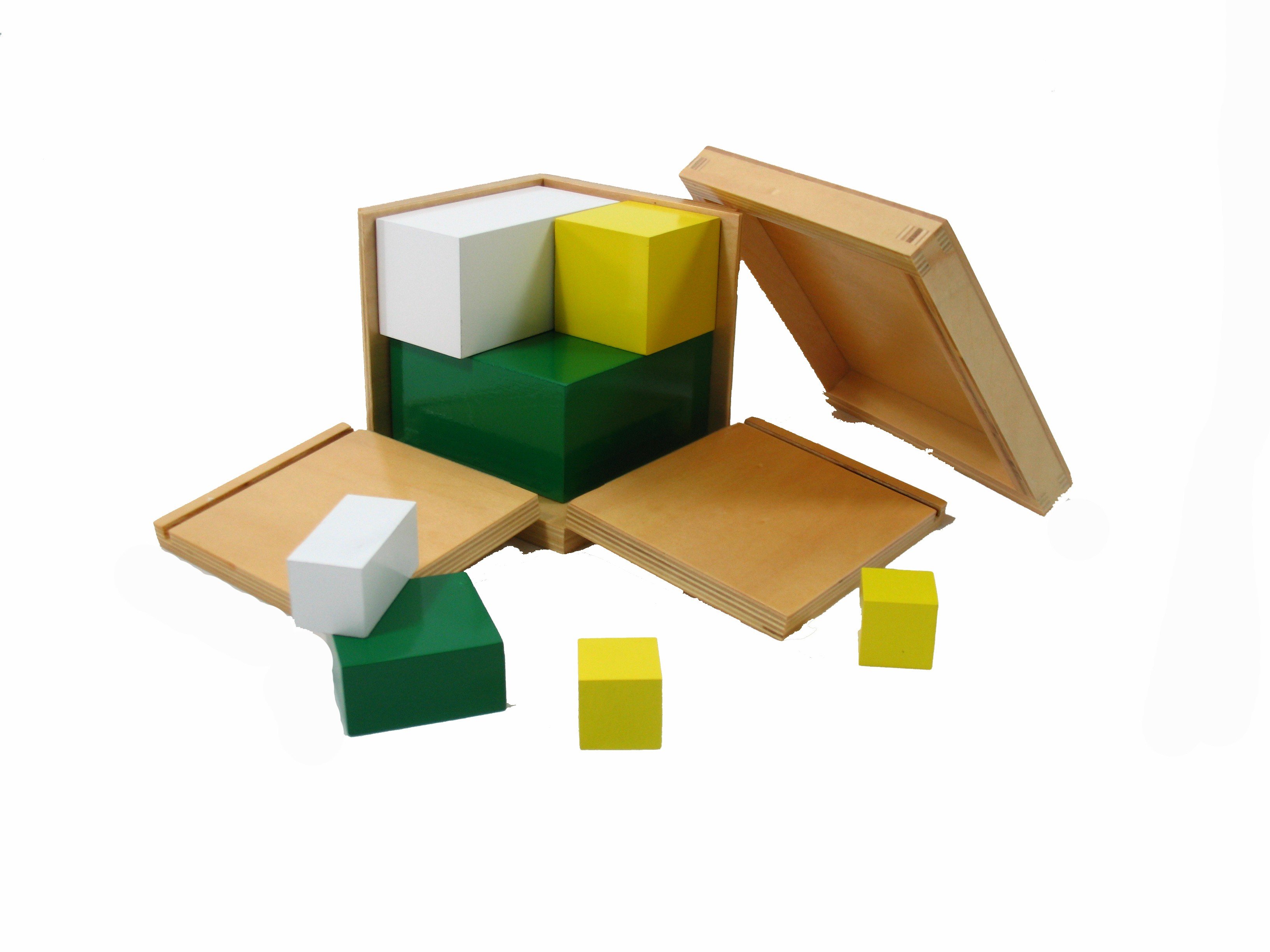 Materiál pomocí svých částí (krychle a hranoly) demonstruje druhou mocninu. Krychle je v dřevěné krabičce. przeczytaj całość
