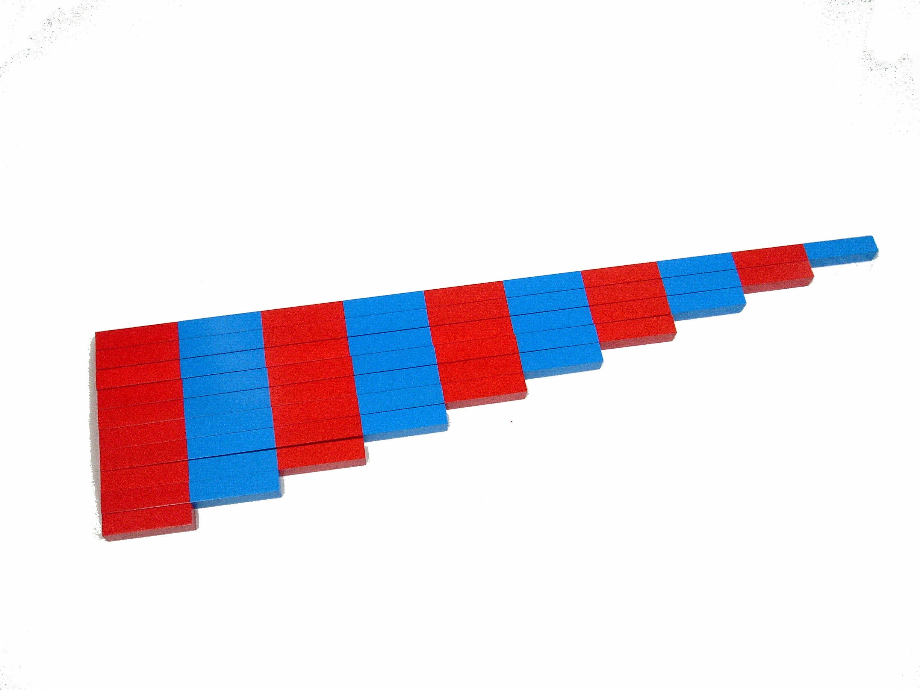 Pomůcka uvádí dítě do světa množství (1 – 10) a jeho pojmenování. Deset červeno-modrých tyčí dovoluje dítěti prožít (hmatem i vizuálně) kvantitu od jedné do deseti. Rozměr 2,5 x 2,5 x 10-100 cm.. Děti seřazují tyče dle velikosti, osvojují si pojmy jako krátký, kratší, nejkratší, dlouhý, delší,...