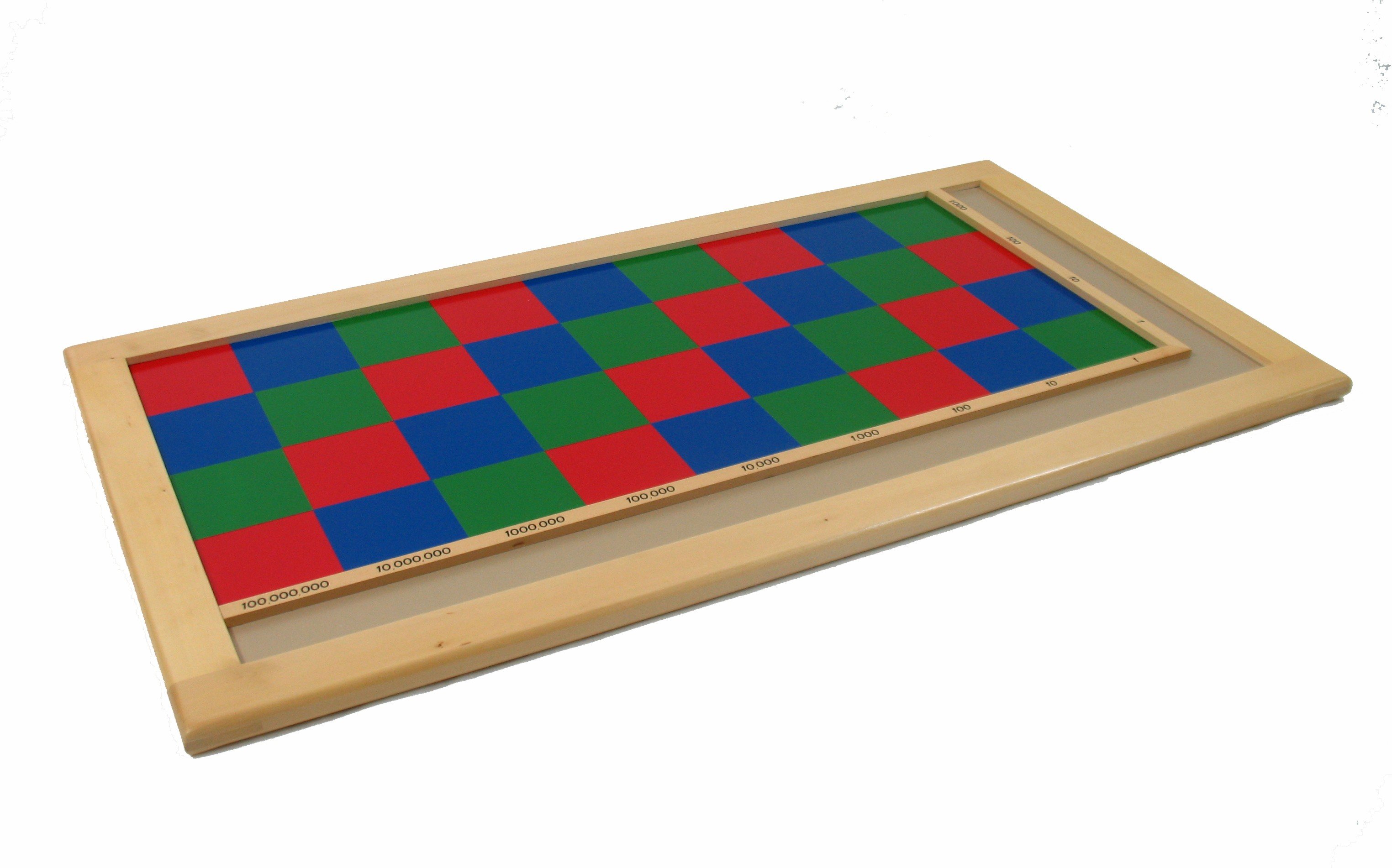 Materiál k násobení víceciferných činitelů. Pomáhá k pochopení posunu řádu při písemném násobení. Dřevěná tabule s trojbarevnou šachovnicí. K materiálu je třeba dokoupit korálky a čísla przeczytaj całość