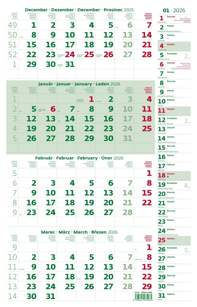 Formát kalendára: 31,5 x 49 cm• Kalendárium: slovenské štvormesačné menné + sviatky vybraných európskych štátov (CZ / SK / A / B / D / F / H / CH / I / PL / RUS / UKR)• Rozsah kalendára: 12 listov• Priestor na prítlač: 31,5 x 7 cm przeczytaj całość