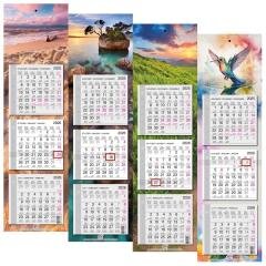 kalendarz ścienny, trójdzielny, wąski z główką płaską z zadrukiem na całych pleckach produkt sprzedawany losowo - mix 6 rodzajów plecków: Sardynia, Mazury, Bałtyk, Tatry, Pieniny, Gracja Kos wymiary: 19,5 x 68,8 cm układ miesięczny z poprzednim i następnym miesiącem posiada numerację tygodni,...