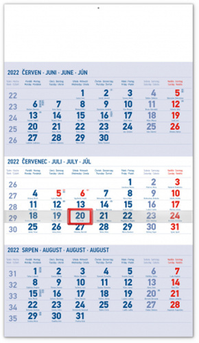 Nástěnný kalendář 3měsíční standard modrý – s českými jmény 2022 (czeski)