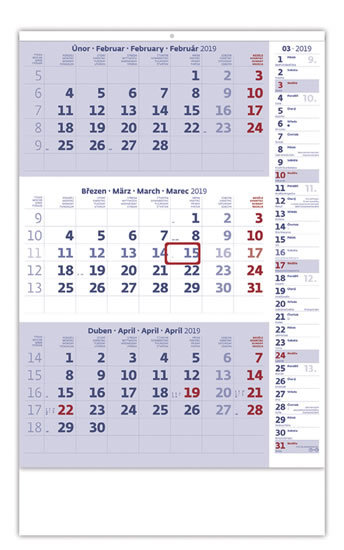 Kalendář nástěnný 2019 - Tříměsíční modrý s poznámkami (czeski)