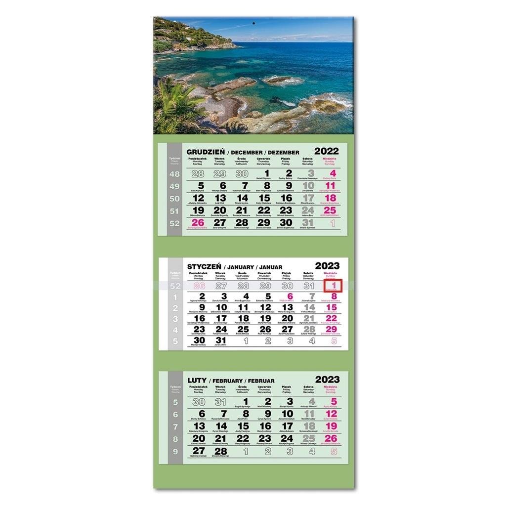 "Kalendarz ścienny 2023, trójdzielny* kalendarz ścienny, trójdzielny z główką wypukłą !!!* wymiary: 33,5 x 76,5 cm* układ miesięczny z poprzednim i następnym miesiącem* posiada numerację tygodni, imieniny* nazwy miesięcy i dni tygodnia w języku polskim, angielskim, niemieckim* kalendaria w...