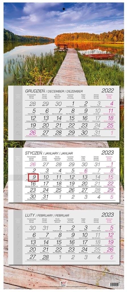 - kalendarz ścienny, trójdzielny z główką płaską z zadrukiem na całych pleckach- wymiary: 33,5 x 79,4 cm- układ miesięczny z poprzednim i następnym miesiącem- posiada numerację tygodni, imieniny- nazwy miesięcy i dni tygodnia w języku polskim, angielskim, niemieckim- kalendaria w różnych kolorach...
