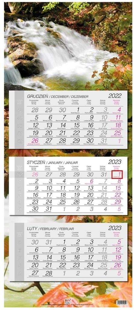 - kalendarz ścienny, trójdzielny z główką płaską z zadrukiem na całych pleckach- wymiary: 33,5 x 79,4 cm- układ miesięczny z poprzednim i następnym miesiącem- posiada numerację tygodni, imieniny- nazwy miesięcy i dni tygodnia w języku polskim, angielskim, niemieckim- kalendaria w różnych kolorach...