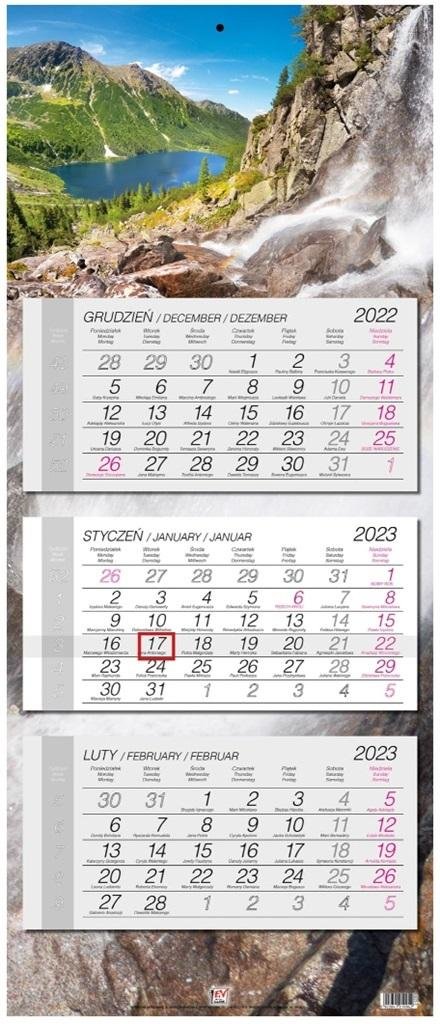 - kalendarz ścienny, trójdzielny z główką płaską z zadrukiem na całych pleckach- wymiary: 33,5 x 79,4 cm- układ miesięczny z poprzednim i następnym miesiącem- posiada numerację tygodni, imieniny- nazwy miesięcy i dni tygodnia w języku polskim, angielskim, niemieckim- kalendaria w różnych kolorach...