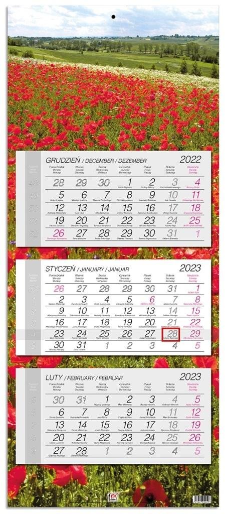 "* kalendarz ścienny, trójdzielny z główką płaską z zadrukiem na całych pleckach* wymiary: 33,5 x 79,4 cm* układ miesięczny z poprzednim i następnym miesiącem* posiada numerację tygodni, imieniny* nazwy miesięcy i dni tygodnia w języku polskim, angielskim, niemieckim* kalendaria w różnych...