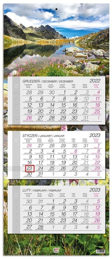 "* kalendarz ścienny, trójdzielny z główką płaską z zadrukiem na całych pleckach* wymiary: 33,5 x 79,4 cm* układ miesięczny z poprzednim i następnym miesiącem* posiada numerację tygodni, imieniny* nazwy miesięcy i dni tygodnia w języku polskim, angielskim, niemieckim* kalendaria w różnych...