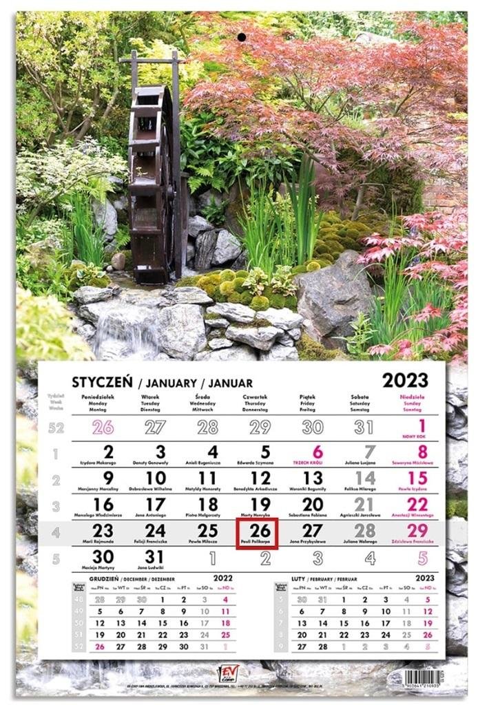 "* kalendarz ścienny, jednodzielny z główką płaską z zadrukiem na całych pleckach* wymiary: 31 x 48 cm* układ miesięczny z poprzednim i następnym miesiącem* posiada numerację tygodni, imieniny* nazwy miesięcy i dni tygodnia w języku polskim, angielskim, niemieckim* kalendaria w różnych kolorach...