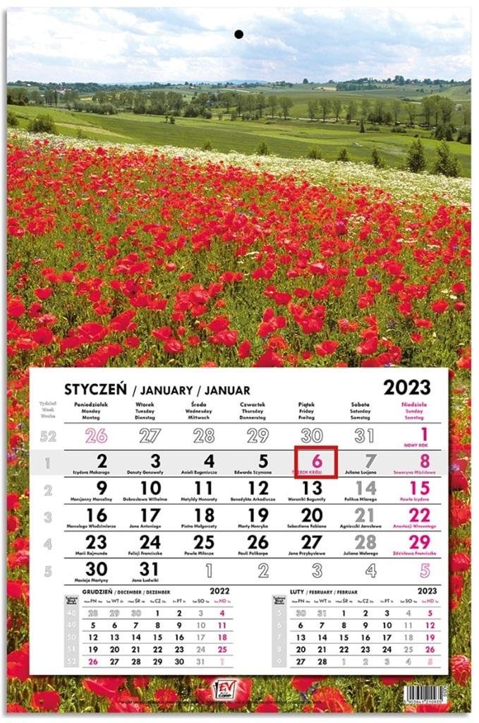 "* kalendarz ścienny, jednodzielny z główką płaską z zadrukiem na całych pleckach* wymiary: 31 x 48 cm* układ miesięczny z poprzednim i następnym miesiącem* posiada numerację tygodni, imieniny* nazwy miesięcy i dni tygodnia w języku polskim, angielskim, niemieckim* kalendaria w różnych kolorach...