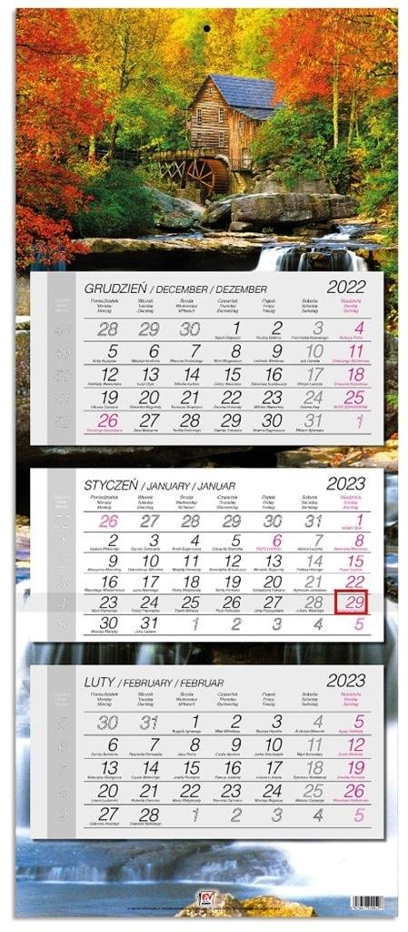 "* kalendarz ścienny, trójdzielny z główką płaską z zadrukiem na całych pleckach* wymiary: 33,5 x 79,4 cm* układ miesięczny z poprzednim i następnym miesiącem* posiada numerację tygodni, imieniny* nazwy miesięcy i dni tygodnia w języku polskim, angielskim, niemieckim* kalendaria w różnych...