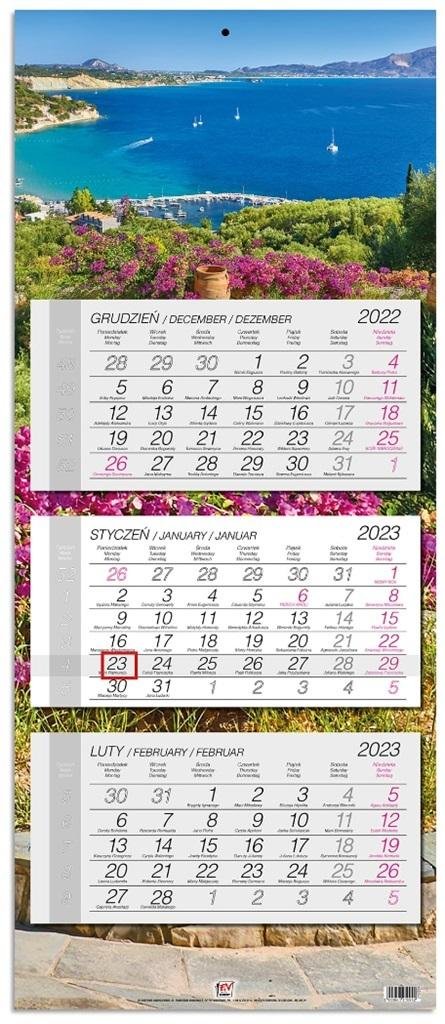 "* kalendarz ścienny, trójdzielny z główką płaską z zadrukiem na całych pleckach* wymiary: 33,5 x 79,4 cm* układ miesięczny z poprzednim i następnym miesiącem* posiada numerację tygodni, imieniny* nazwy miesięcy i dni tygodnia w języku polskim, angielskim, niemieckim* kalendaria w różnych...