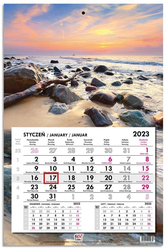 "* kalendarz ścienny, jednodzielny z główką płaską z zadrukiem na całych pleckach* wymiary: 31 x 48 cm* układ miesięczny z poprzednim i następnym miesiącem* posiada numerację tygodni, imieniny* nazwy miesięcy i dni tygodnia w języku polskim, angielskim, niemieckim* kalendaria w różnych kolorach...