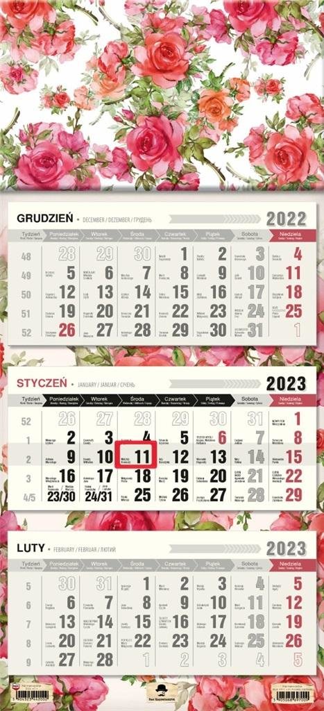 Kalendarz 2023 trójdzielny płaska główka Róże