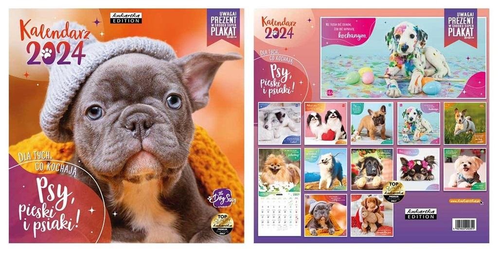 Kwadratowy kalendarz ścienny na rok 2024 z serii "Psy, pieski i psiak". Każdy miesiąc przyozdabia inny psiak, który będzie wspaniałą ozdobą Waszego domu. Taki kalendarz to idealny prezent dla miłośników psów. Kalendarz po rozłożeniu ma wymiary 30x60 cm - górny kwadrat wypełnia zdjęcie, a dolny...