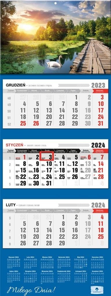 Kalendarz Trójdzielny PREMIUM Z WYPUKŁĄ GŁÓWKĄ. Format 315/810mm. Trzy komplety klasycznych kalendariów z przesuwnym okienkiem. Główka z otworem wierconym. Dodatkowo nazwy miesiąca i dni tygodnia w języku Ukraińskim, Angielskim i Niemieckim. Kalendarium dodatkowo zawiera fazy księżyca i znaki...