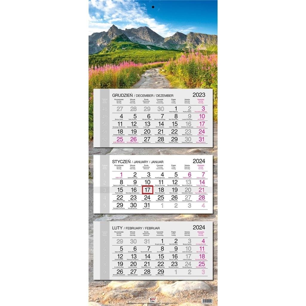 Kalendarz ścienny, trójdzielny z główką płaską z zadrukiem na całych pleckach.Wymiary: 33,5 x 79,4 cm.Układ miesięczny z poprzednim i następnym miesiącem.Posiada numerację tygodni, imieniny.Nazwy miesięcy i dni tygodnia w języku polskim, angielskim, niemieckim.Kalendaria w różnych kolorach do...