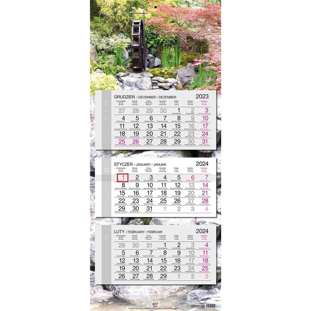Kalendarz ścienny, trójdzielny z główką płaską z zadrukiem na całych pleckach.Wymiary: 33,5 x 79,4 cm.Układ miesięczny z poprzednim i następnym miesiącem.Posiada numerację tygodni, imieniny.Nazwy miesięcy i dni tygodnia w języku polskim, angielskim, niemieckim.Kalendaria w różnych kolorach do...