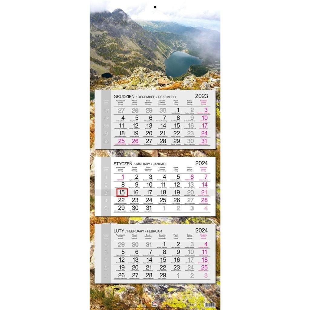 Kalendarz ścienny, trójdzielny z główką płaską z zadrukiem na całych pleckach.Wymiary: 33,5 x 79,4 cm.Układ miesięczny z poprzednim i następnym miesiącem.Posiada numerację tygodni, imieniny.Nazwy miesięcy i dni tygodnia w języku polskim, angielskim, niemieckim.Kalendaria w różnych kolorach do...
