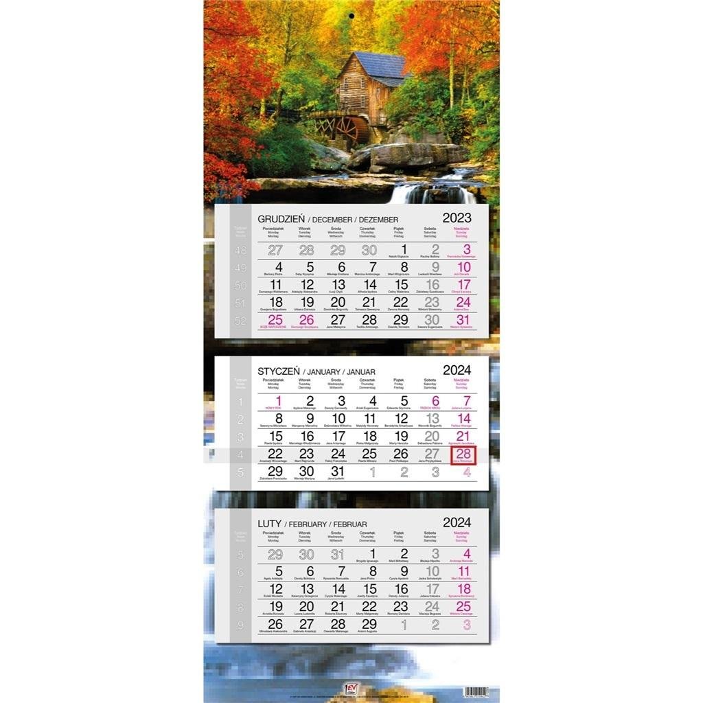 Kalendarz ścienny, trójdzielny z główką płaską z zadrukiem na całych pleckach.Wymiary: 33,5 x 79,4 cm.Układ miesięczny z poprzednim i następnym miesiącem.Posiada numerację tygodni, imieniny.Nazwy miesięcy i dni tygodnia w języku polskim, angielskim, niemieckim.Kalendaria w różnych kolorach do...