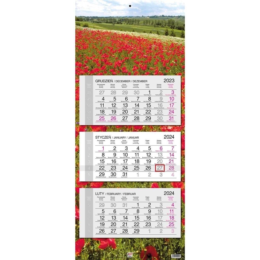 Kalendarz ścienny, trójdzielny z główką płaską z zadrukiem na całych pleckach.Wymiary: 33,5 x 79,4 cm.Układ miesięczny z poprzednim i następnym miesiącem.Posiada numerację tygodni, imieniny.Nazwy miesięcy i dni tygodnia w języku polskim, angielskim, niemieckim.Kalendaria w różnych kolorach do...