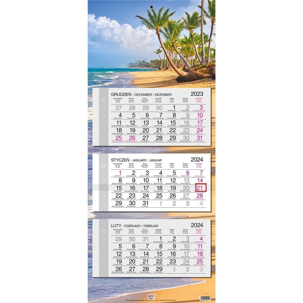Kalendarz ścienny, trójdzielny z główką płaską z zadrukiem na całych pleckach.Wymiary: 33,5 x 79,4 cm.Układ miesięczny z poprzednim i następnym miesiącem.Posiada numerację tygodni, imieniny.Nazwy miesięcy i dni tygodnia w języku polskim, angielskim, niemieckim.Kalendaria w różnych kolorach do...