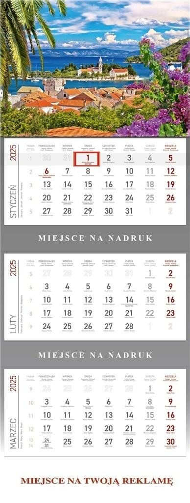 nr katalogowy: KS055Bukład: trzymiesięcznyformat główki: 295 x 210 mmformat kalendarza: 776 x 295 mmformat kalendarium: 280 x 133 mmobszar nadruku: 280x60 mmopakowanie zbiorcze: 18 szt.minimum logistyczne: 18 szt.Kalendarz jednodzielny wiszący ścienny z kalendarium w układzie trzymiesięcznym z...