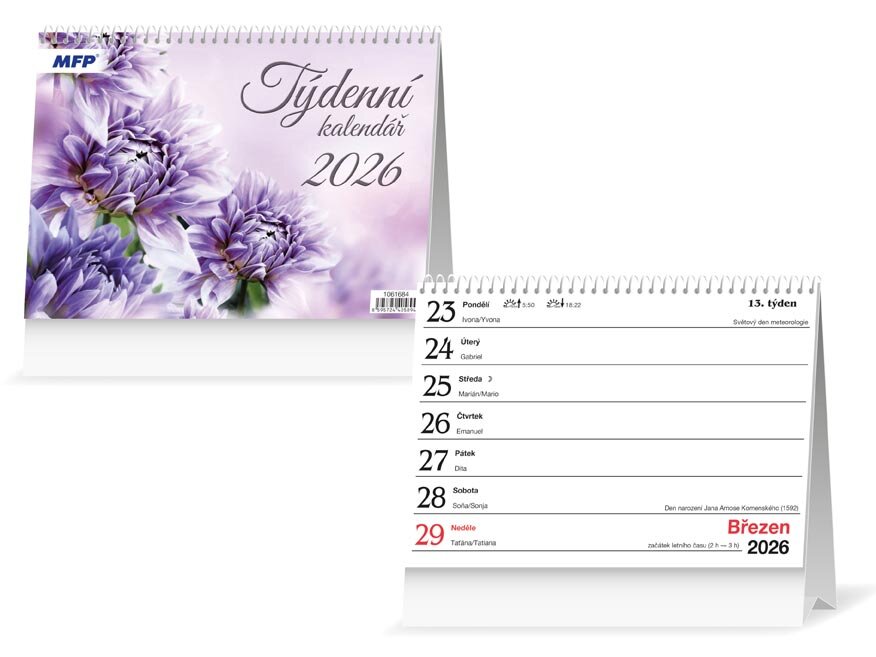Biurkowy, tygodniowy kalendarz na rok 2026. Nadaje się do zapisywania ważnych notatek oraz do organizowania różnych wydarzeń codziennego życia. Możliwość nadruku firmowego logo i tekstu na dolnej części kalendarza.