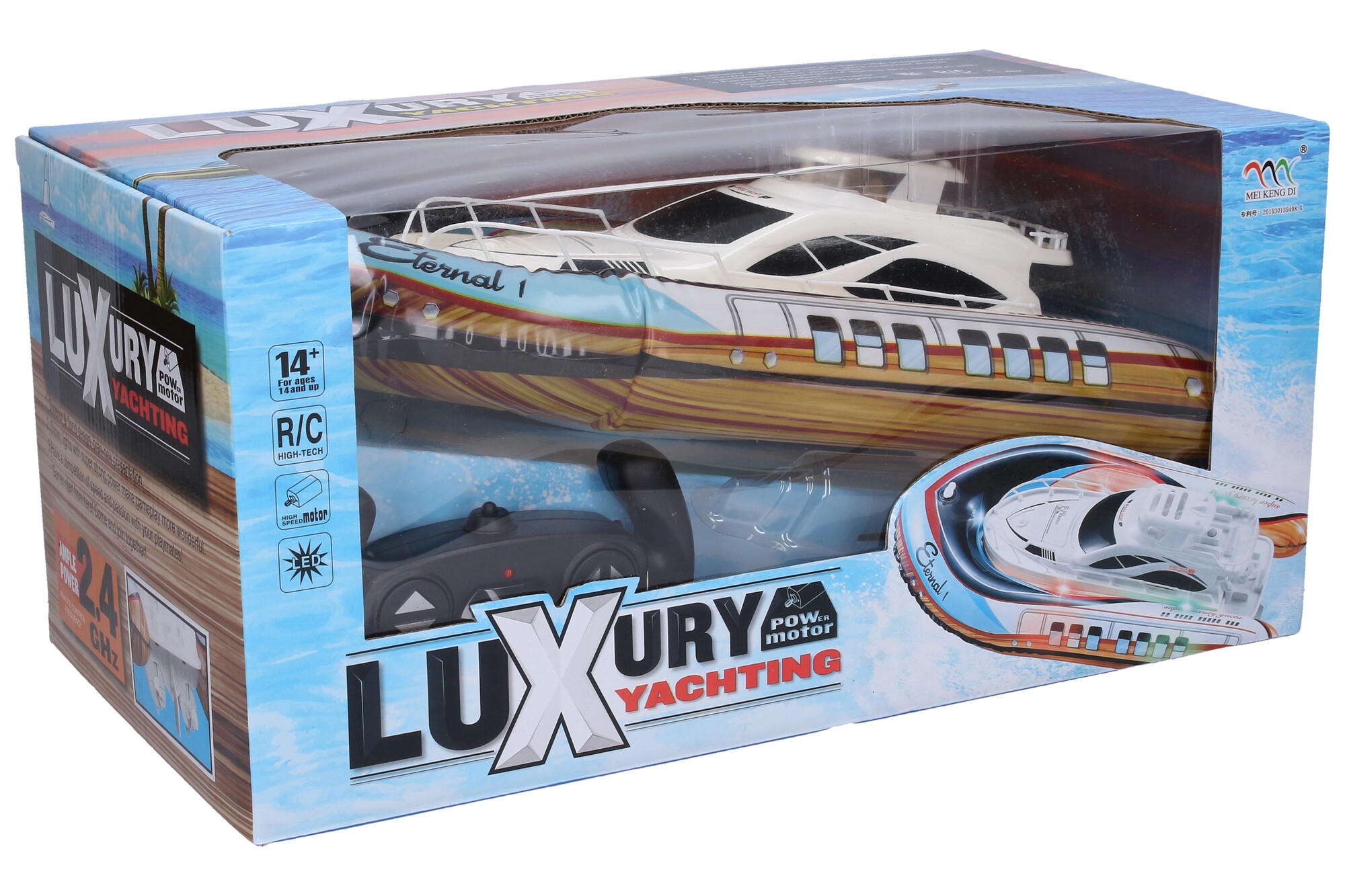 Nadmuchiwana łódź/jacht RC zdalnie sterowana. Wymiary 37x20x6 cm. Częstotliwość 2,4 GHz. Efekty świetlne. 4x baterie AA do łodzi, 2x baterie AA do pilota nie są dołączone. Przycisk ON/OFF na łodzi, przełącznik ON/OFF na pilocie. Pompka w zestawie. przeczytaj całość