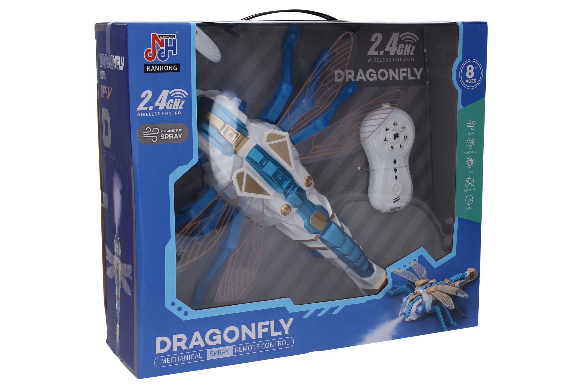 Zdalnie sterowana ważka RC wydzielająca dym. Wymiary 33x32x7,5 cm. Częstotliwość 2,4GHz. Efekty świetlne, dźwiękowe i dymne. Przyciski na pilocie - poruszanie do przodu, do tyłu, skręcanie, 3 tryby efektów dymnych, 2 tryby demo, dźwięk. Akumulator 3,7V do ważki w zestawie, 2xAA do pilota nie są w zestawie. Przełącznik ON/OFF na spodniej stronie ważki. Zbiorniczek na wodę na spodniej stronie głowy. Kabel USB i pojemniczek na wodę w zestawie.