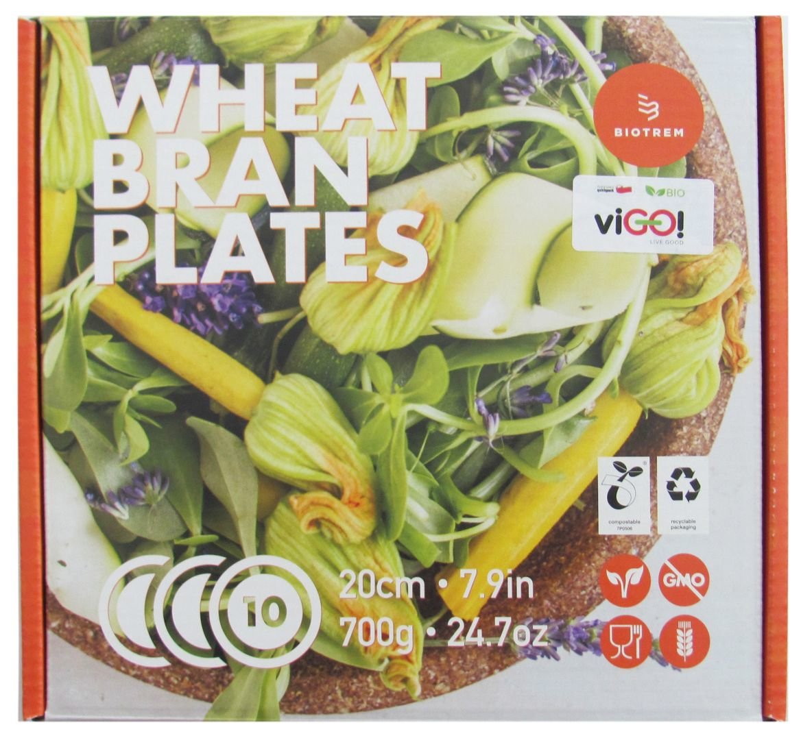 100% přírodní talíř o průměru 20 cm, vyrobený z pšeničných otrub - balení 10 ks. Talíře jsou pevné a odolné proti mastnotě, jsou vhodné pro teplé i studené, stálé či tekuté pokrmy. Lze použít v horkovzdušné (max. teplota 180°C) i v mikrovlnné troubě. Po použití mají schopnost rozkladu do 30 dní....