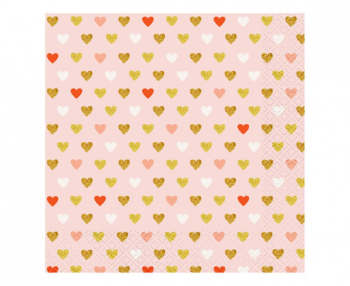 Różowe papierowe serwetki z serduszkami w kolorach czerwonym, złotym i białym. Vhodné na narozeninové oslavy, svatební dekorace nebo rozlučky se svobodou. Serwetki są praktycznym dodatkiem do dekoracji. Wymiary: 33 x 33 cm. Opakowanie: 20 szt. przeczytaj całość