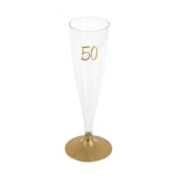 Elegantní plastová sklenička na sekt s číslovkou 50. Sada obsahuje 6 ks šampusek o objemu 14 cl.Sklenka samotná je z transparentního materiálu, připomínajícího sklo, stopka je ve zlaté barvě. Skvělý dekorační doplněk na Vaší oslavu narozenin nebo výročí. Lze opakovaně použít. Vhodné do myčky...