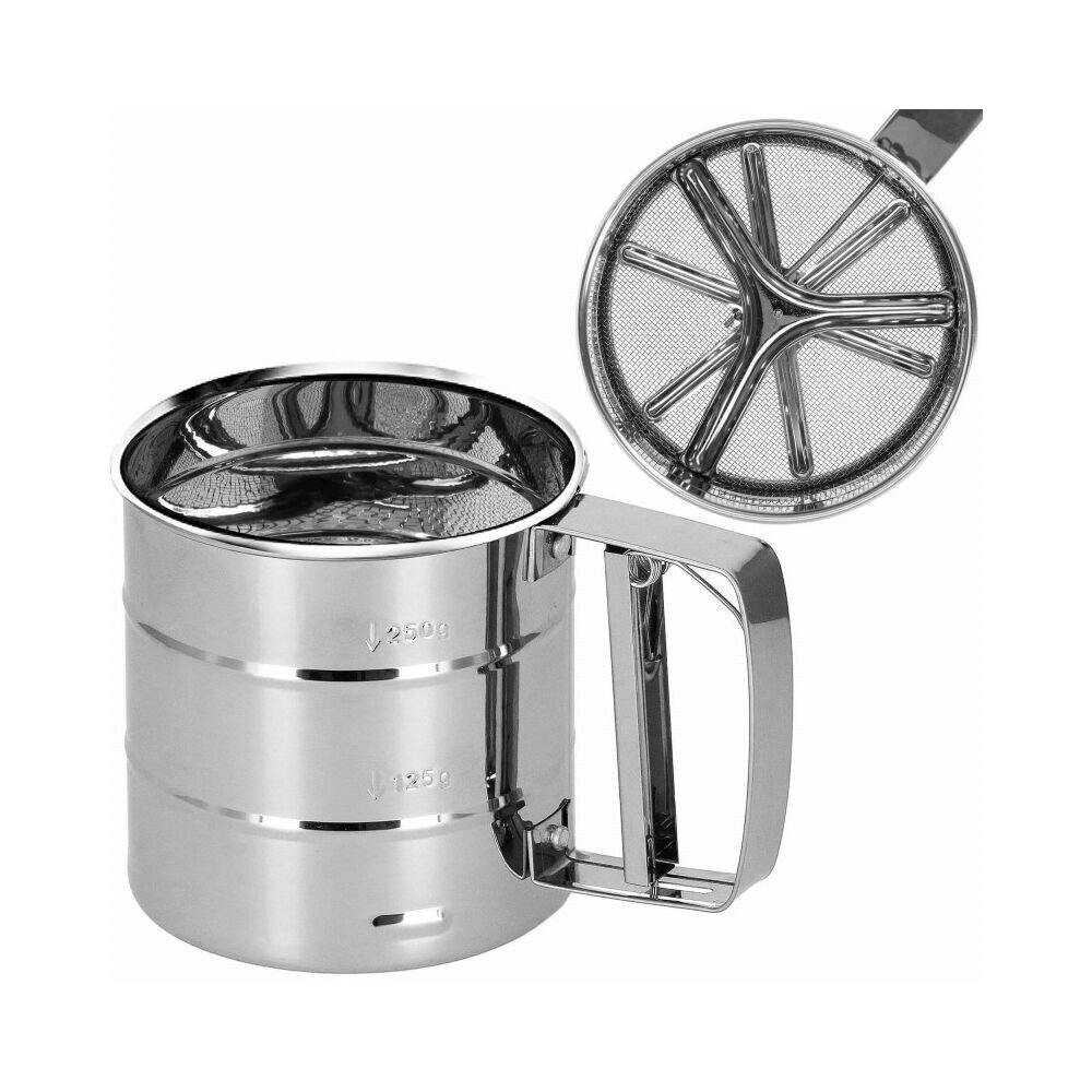 Automatický prosévač mouky s odměrkou. Nástroj provzdušňující mouku. Snadné užívání a čištění, ergonomická rukojeť. Pohyblivé sítko, horizontální značky pro lepší orientaci hmotnosti. Vyrobeno z odolné nerezové oceli. Ergonomická rukojeť. Praktický doplněk na přípravu dokonalého pečení. przeczytaj całość