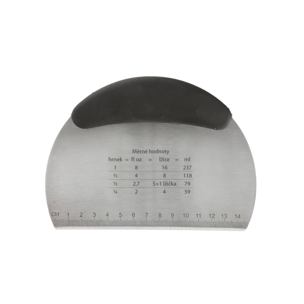 Kucharska szpatułka szybko uczyni z Ciebie profesjonalnego kucharza. Przy jej pomocy łatwo przeniesiesz pokrojone warzywa na patelnię, idealnie wyczyścisz deskę do krojenia, pomoże Ci szybko posiekać nawet gotowane warzywa czy jajka oraz podzielić ciasto. Możesz jej użyć także przy gotowaniu haluszek, różnych dodatków do zup i przy obróbce ciasta. Niezastąpiony pomocnik. Dzięki wzmocnieniu doskonale leży w dłoni. Na krawędzi oznaczone jednostki długości w cm (0-14,7 cm), z jednej strony oznaczone przeliczenia miar (kubek - fl oz - łyżka - ml). Materiał: stal nierdzewna 430, guma TPR, tworzywo sztuczne PP. Wymiary: 16x12 cm. Nie nadaje się do zmywarki.