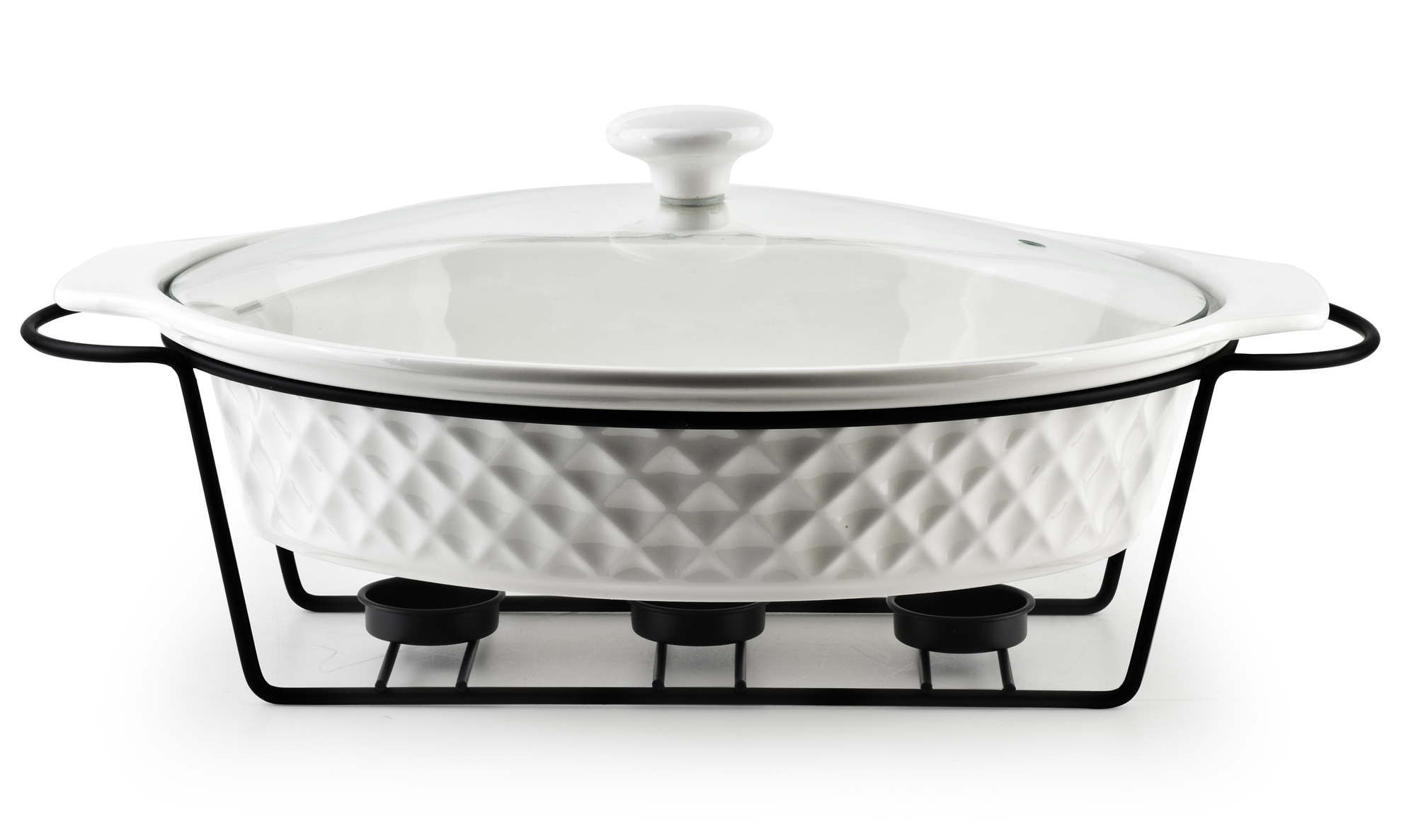 Naczynie z podgrzewaczem marki COOKINI z serii MODERN KITCHEN poj. 2,6L, 42x28x17,5cm to serwowanie potraw na co dzień i od święta. . Kolor: biały, czarny stelaż . Materiał: kamionka...