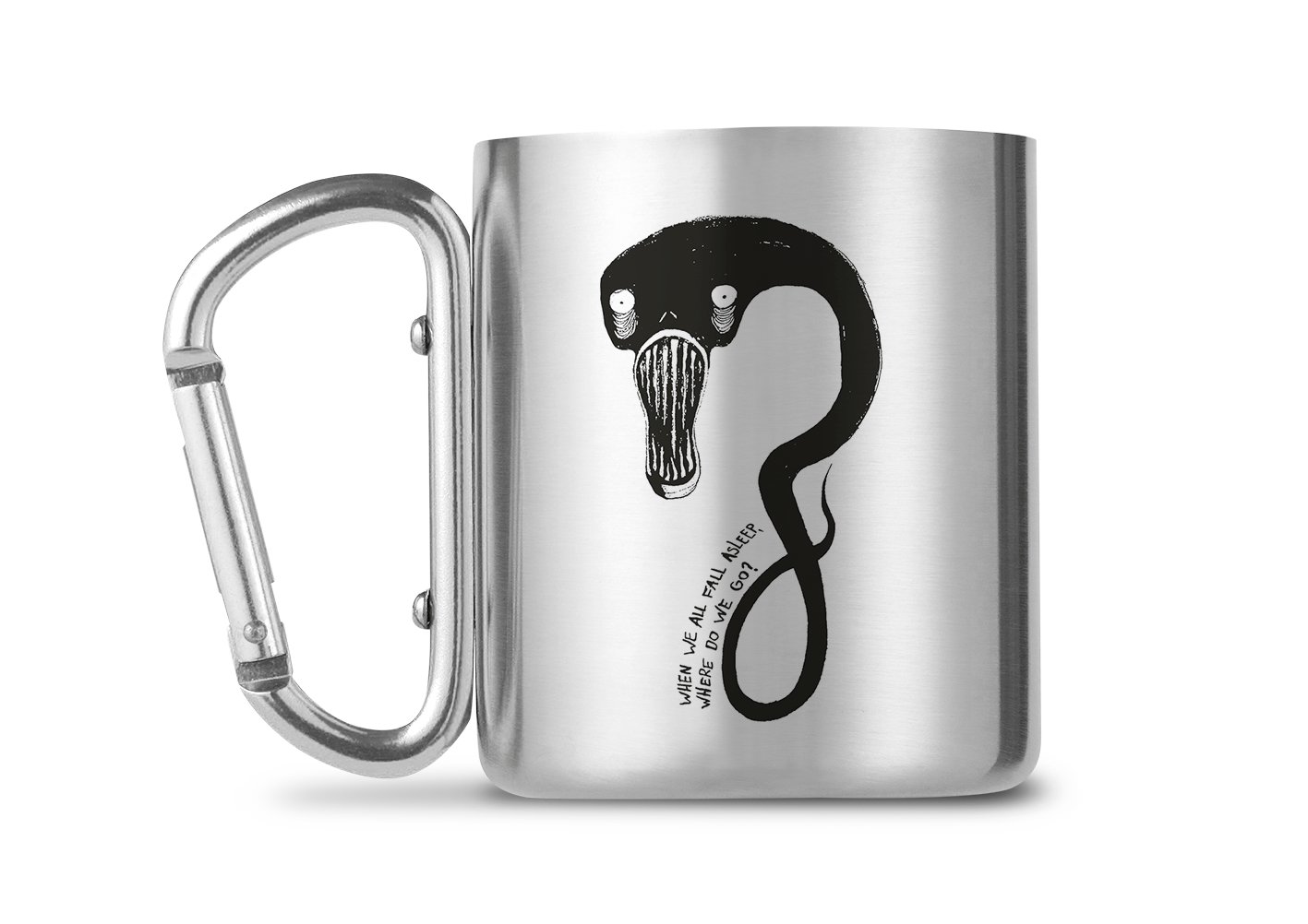 Kovový hrnek s karabinou s logem hudební zpěvačky a skladatelky Billie Eilish.
