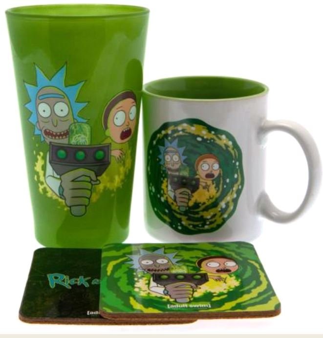 Dárkový set Rick And Morty: Portal (objem sklenice 500 ml, hrnek 300 ml, 2 tácky 10 x 10 cm)