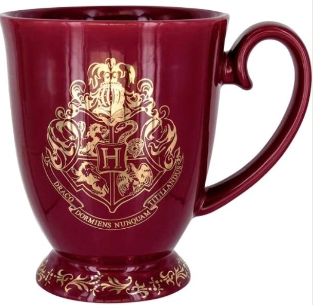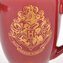 Bordowy ceramiczny kubek z motywem magicznego świata Hogwartu. Kubek zawiera herb szkoły w Hogwarcie, w tym symbole każdej z czterech domów: Gryffindor (lew); Hufflepuff (borsuk); Ravenclaw (kruk); i Slytherin (wąż).