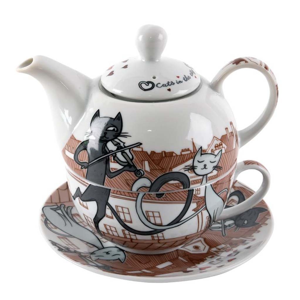 Třídílný čajový set v designu Kočky ve městě. przeczytaj całość